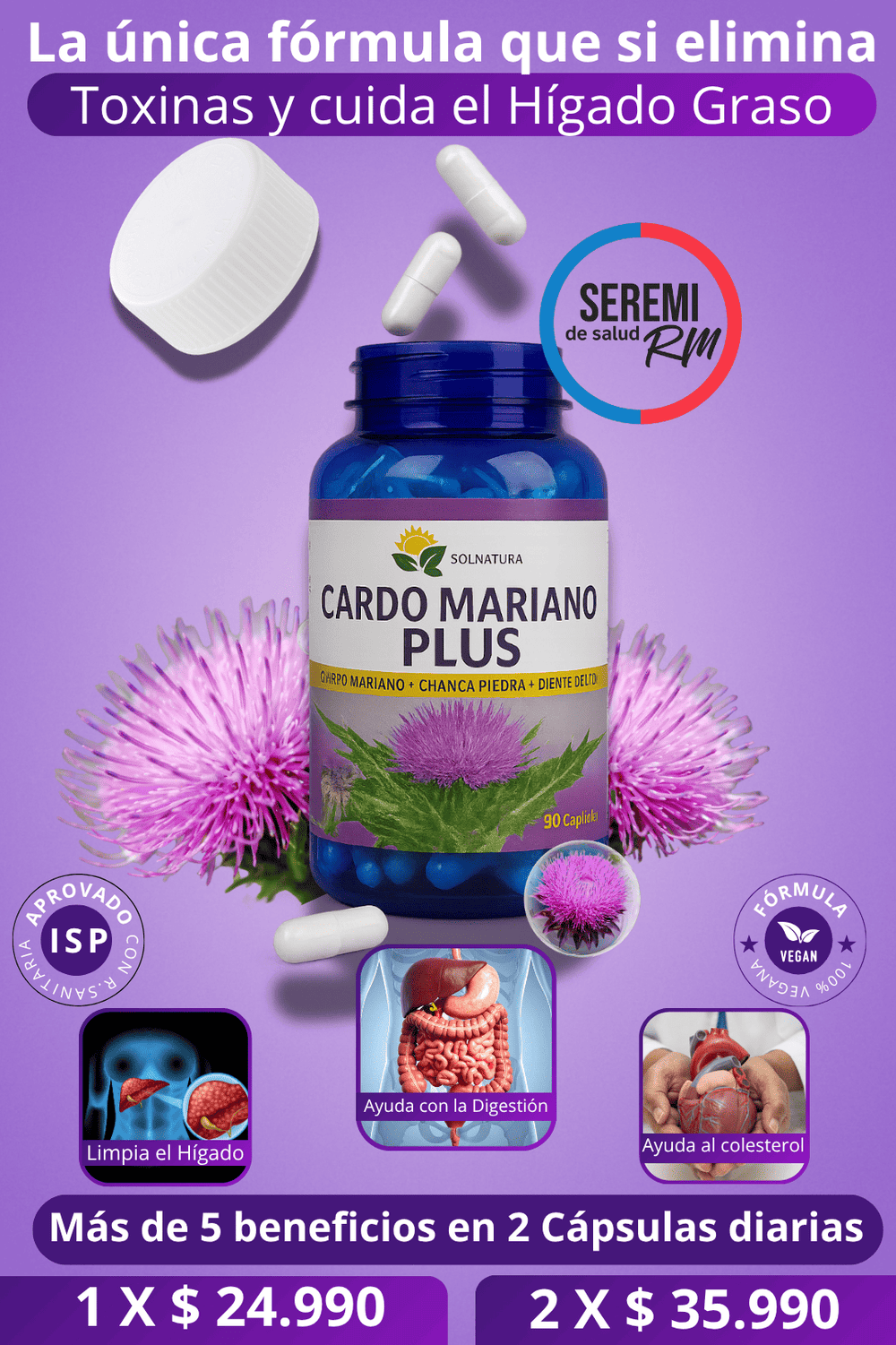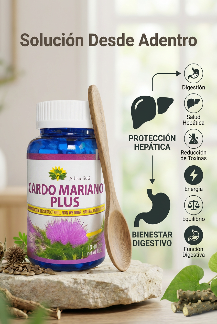 Contiene silimarina, el componente más estudiado para la salud hepática, que actúa como un potente antioxidante y protector celular, ayudando a mantener el hígado libre de toxinas y en perfecto estado de funcionamiento.