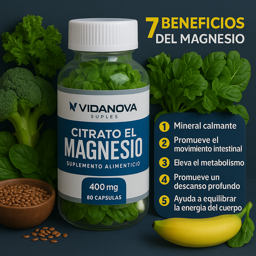 Respuesta 1: El citrato de magnesio ayuda a equilibrar el sistema nervioso, mejora la digestión, combate el estreñimiento, reduce calambres, fortalece la salud del corazón, regula la presión arterial y apoya el control de la glucosa en sangre, además de mejorar la calidad del sueño.